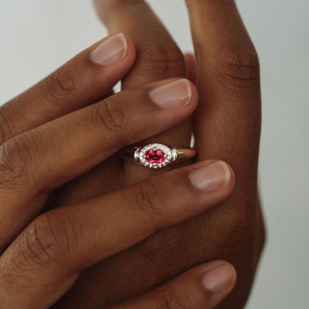 Inspired by the silver linings of childhood. The nostalgia of a hot pink gemstone brings memories of playing dress-up for hours, invading our mother’s lipstick drawers, collecting sticker books, and painting our whole hands with nail polish.