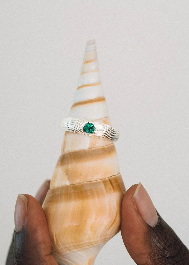 The Oasis Ring commemorates a moment of calm and refuge within our everyday. It symbolizes the idyllic, the pleasant, the exhale, and holds a sparkling green quartz, almost as if it’s also holding a secret. The hand-carved wavy pattern is borrowed from The Earth Ring, which just so happens to be its perfect stacking companion.