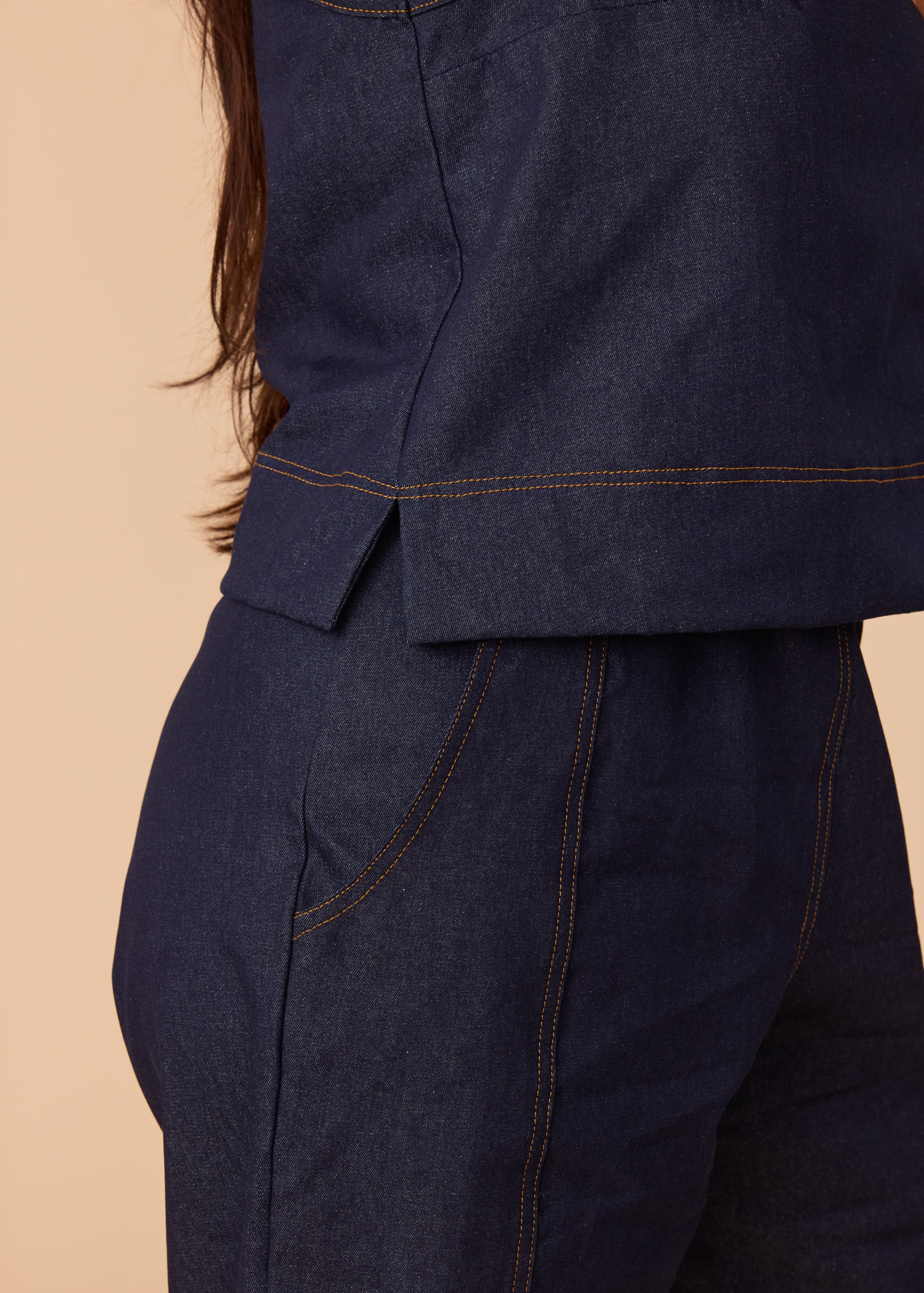 • Indigo is made of 100% Cotton 6 oz. denim twill, Ivory and Gingham are made of 100% linen, a durable fibre derived from flax, produced without fertilizers or pesticides