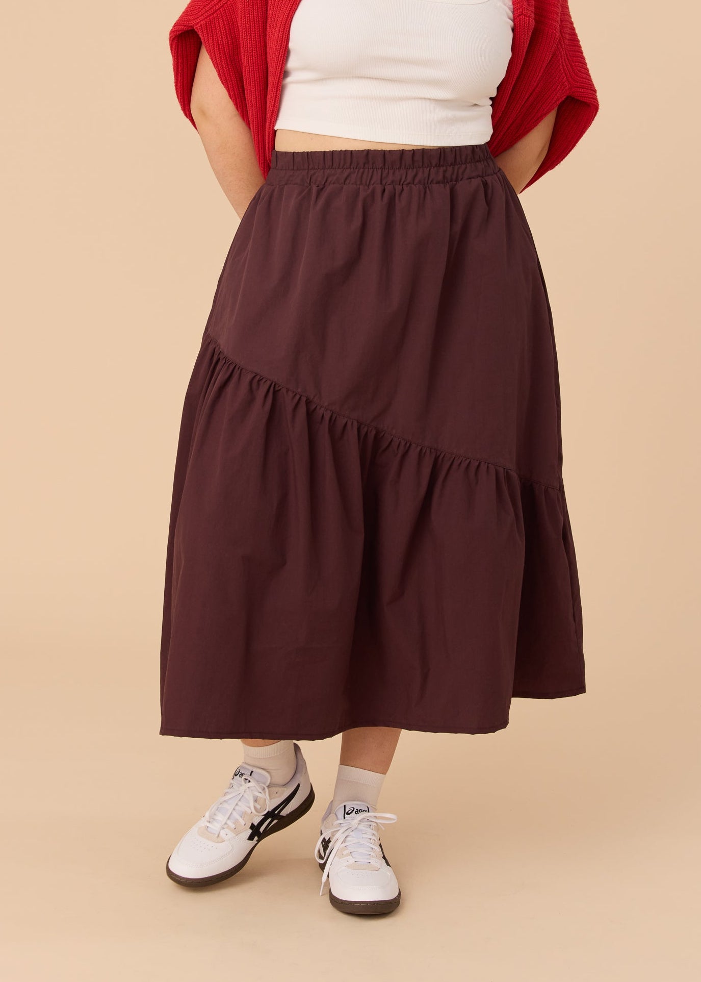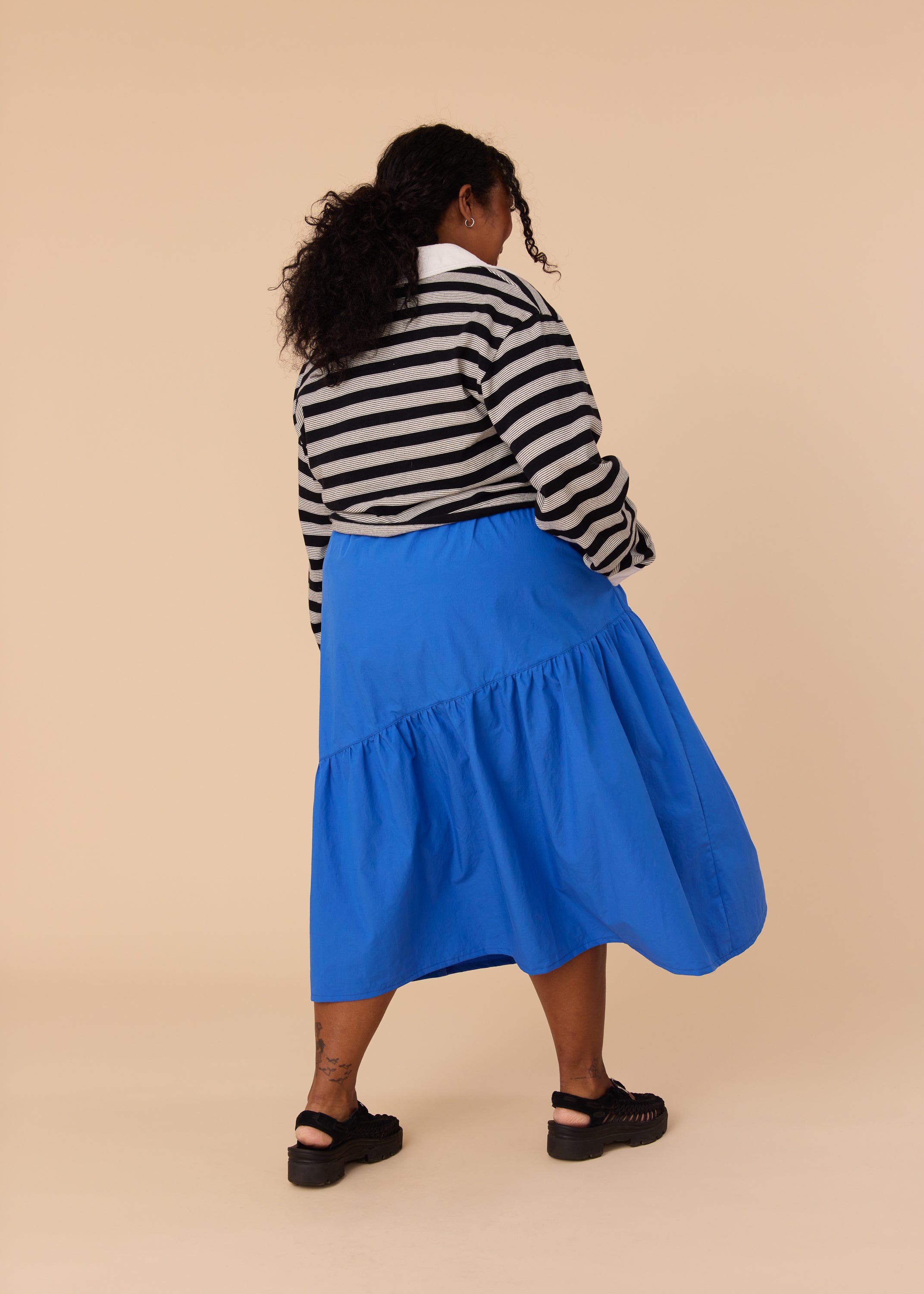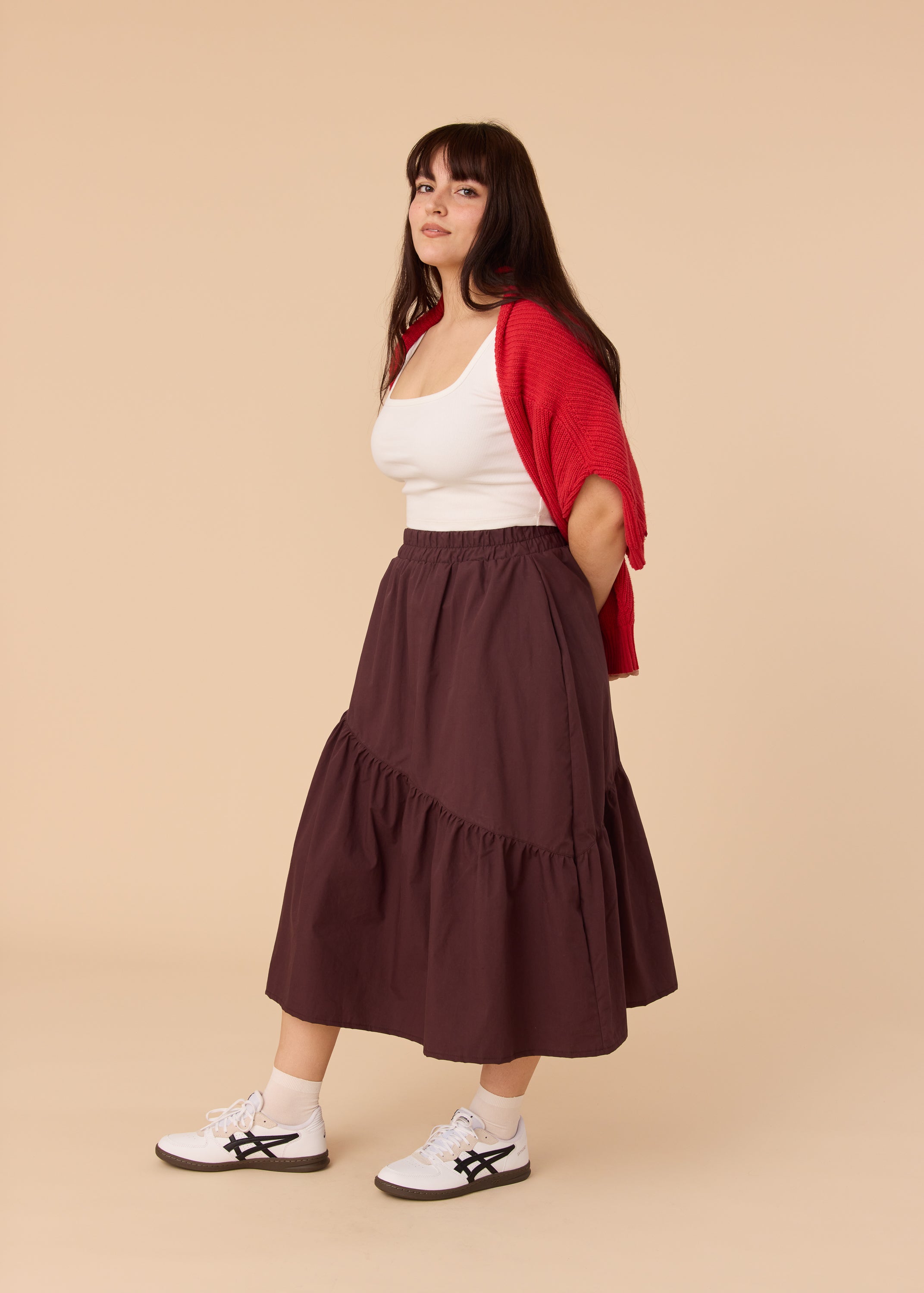 A fresh spin on a midi skirt - this version has an asymmetrical seam with extra gathers
