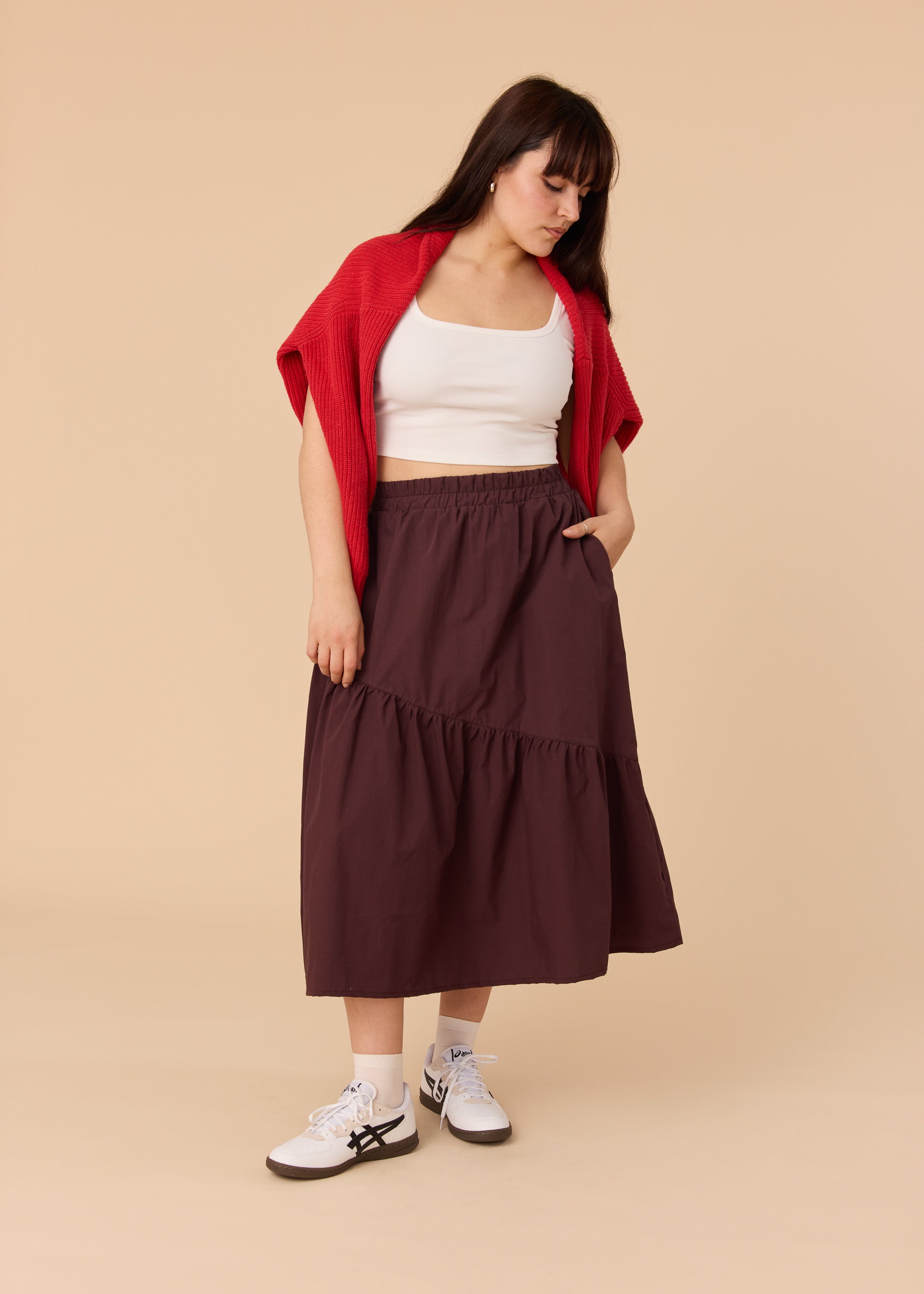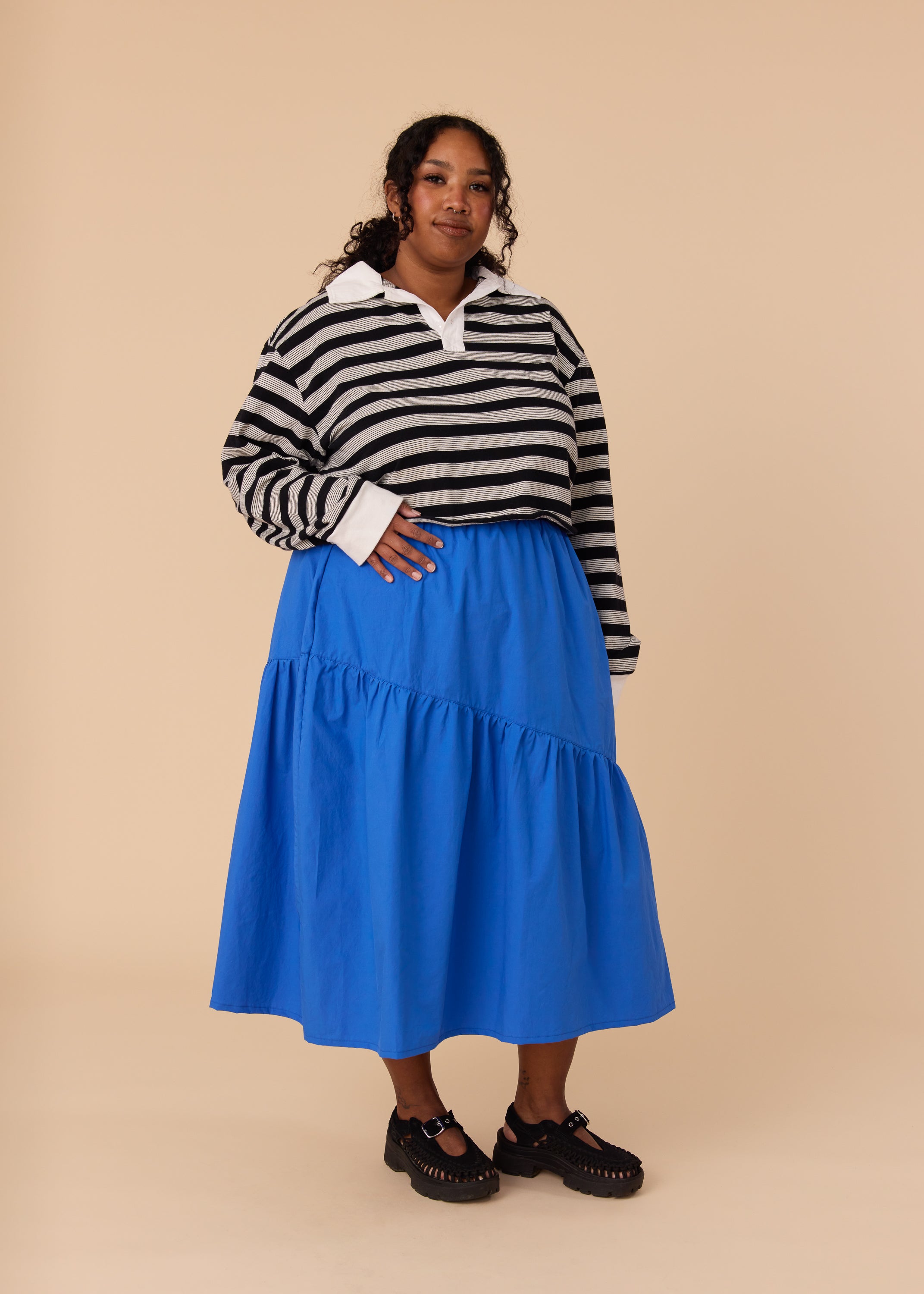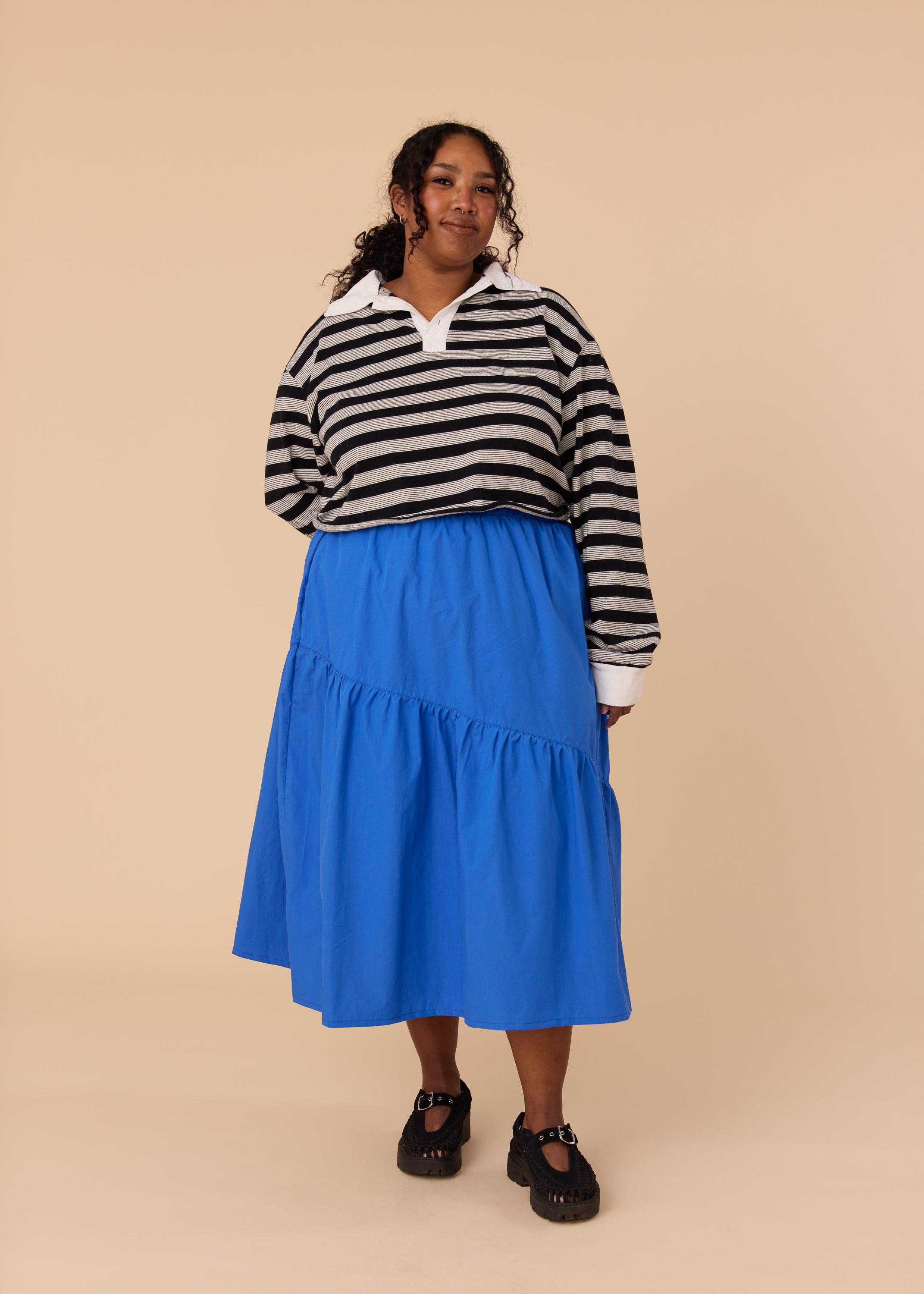 A fresh spin on a midi skirt - this version has an asymmetrical seam with extra gathers