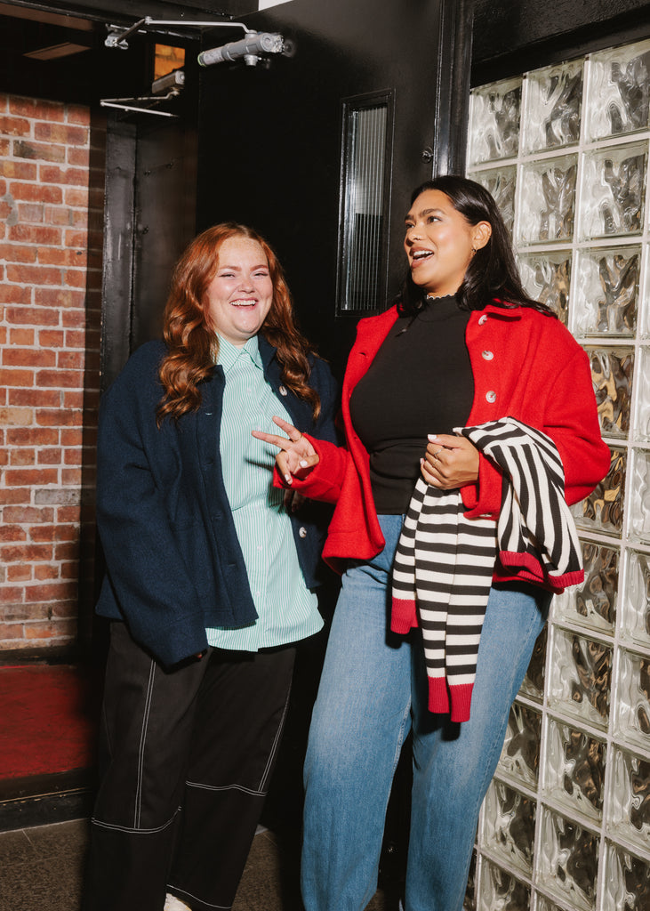 + Jenie is wearing a 1X in Navy and an XL in True Red