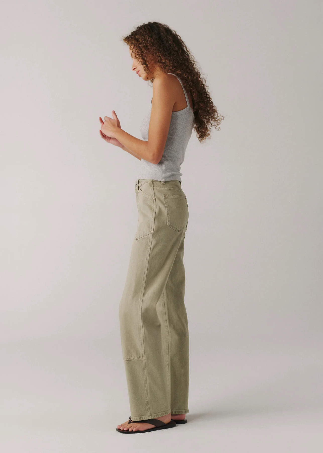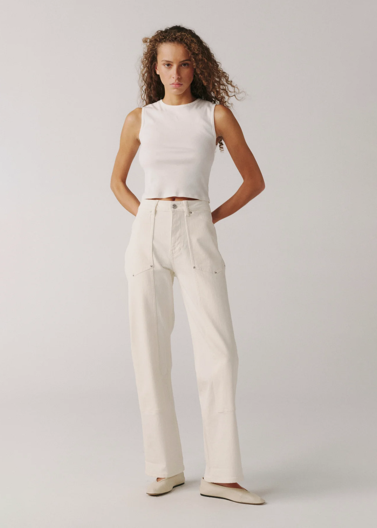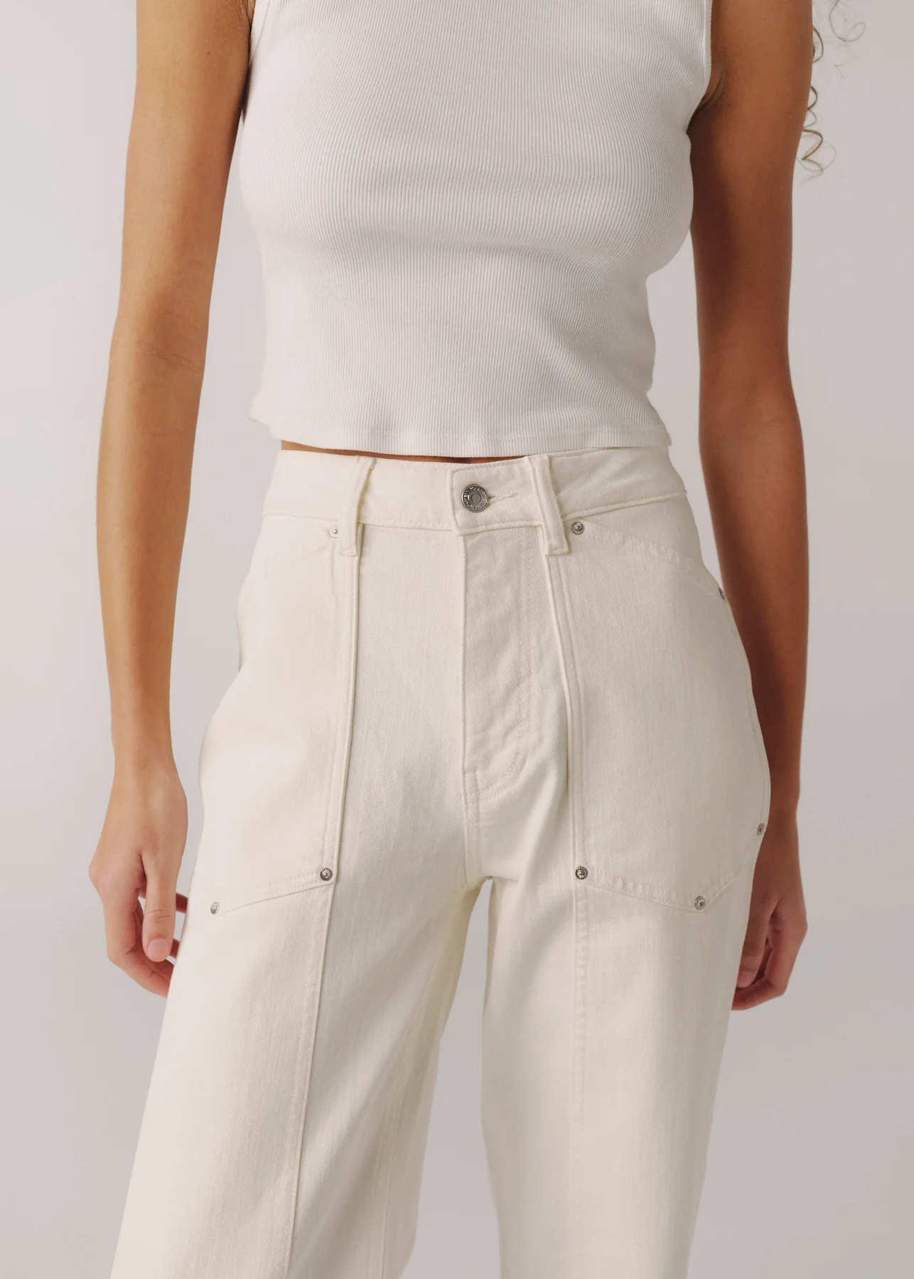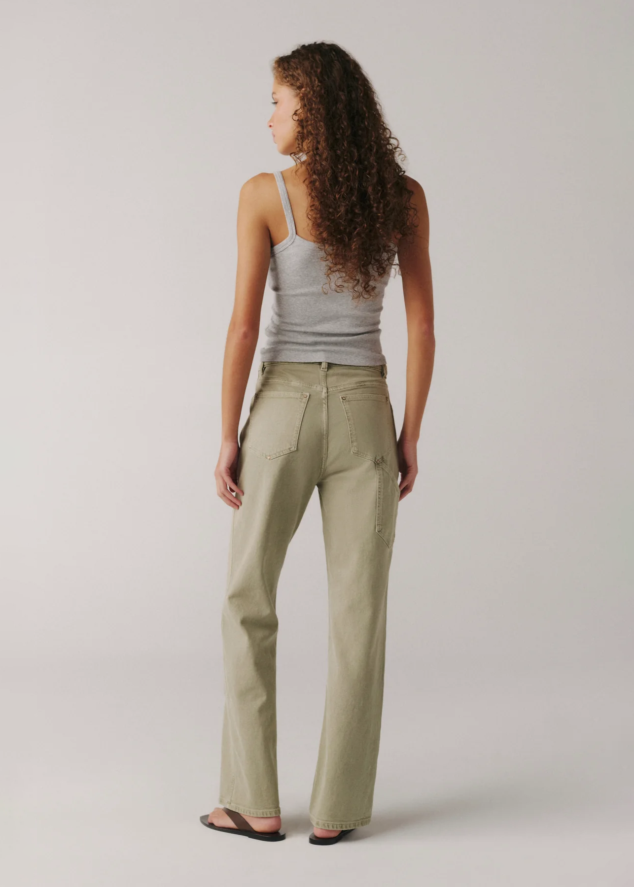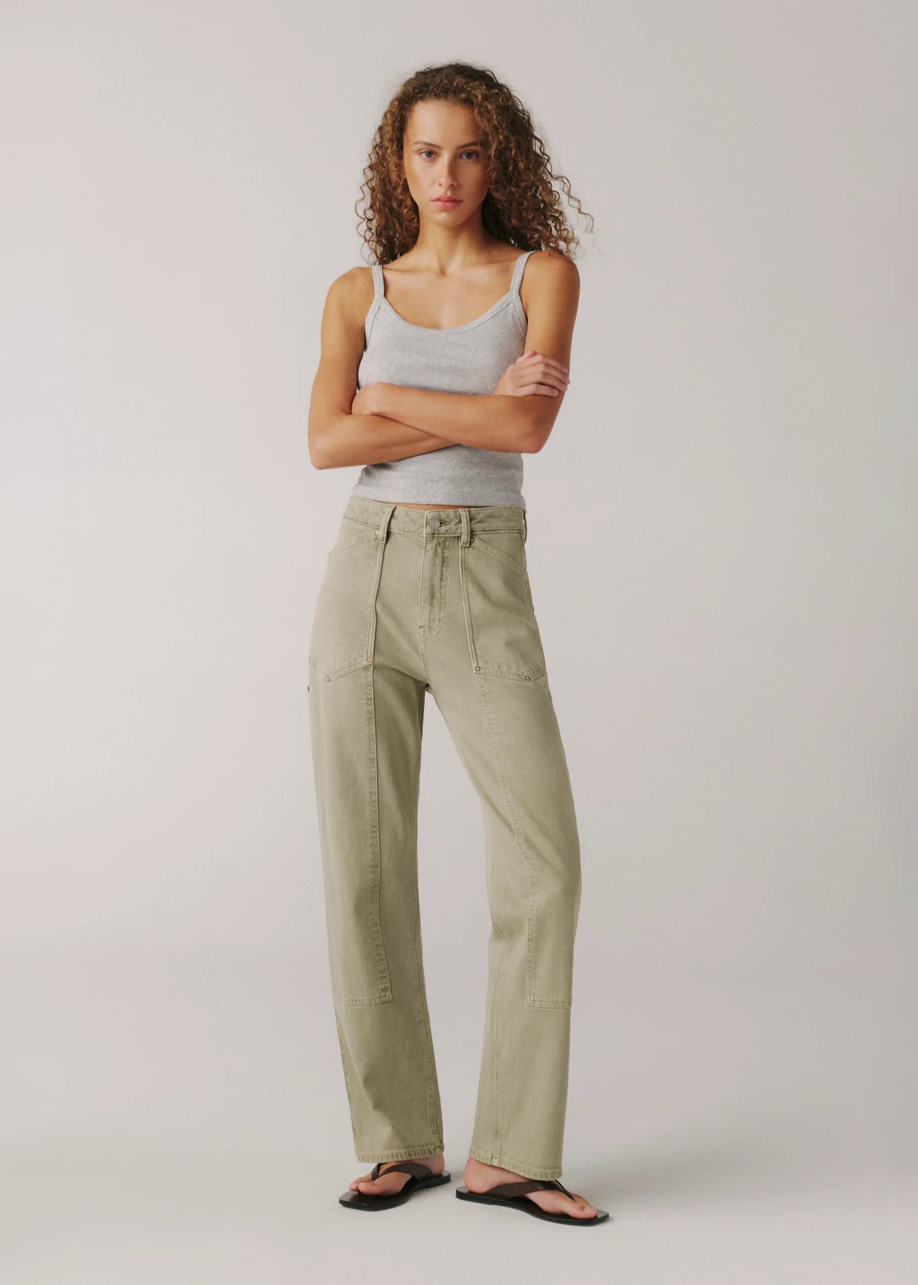 SAT is a high-rise straight jean that's a nod to the most-loved '90s denim style, featuring square utility pockets, double-knee detailing, vintage hardware, and tonal stitching for modern workwear appeal.